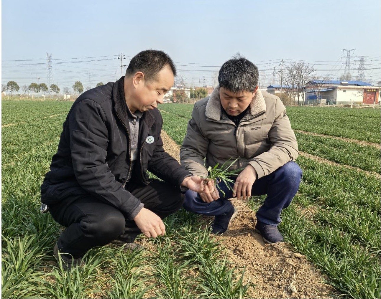 2月18日,在周庄镇耿庄村华丰家庭农场的麦田里,农技协的科普专家们正细心观察小麦根部的生长情况,针对可能存在的病害问题进行了深入分析,向农场主提出了当前小麦管理合理施肥、病虫害防治等方面的建议。